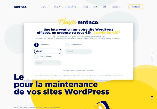 Optez pour une solution 100% en ligne, rapide et efficace. Service externalisé de maintenance et d’assistance de sites internet. Maintenance, assistance, mise à jour, optimisation, par abonnement, par ticket, … Confiez votre webmastering à des experts métiers ! mntnce. vous apporte sous 24h toutes les solutions dont vous avez besoin pour la bonne marche de vos sites internet. Solutions aujourd’hui disponibles pour le CMS WordPress. voir moins