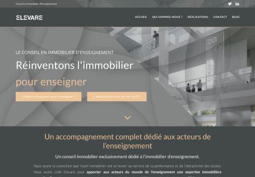 Nous avons la conviction que l’outil immobilier est un levier au service de la performance et de l’attractivité des écoles. Nous avons créé Elevare pour apporter aux acteurs du monde de l’enseignement une expertise immobilière approfondie et les accompagner sur toute la chaîne de valeur immobilière : recherche de locaux ERP adaptés pour les écoles, conseil en implantation, aménagement des locaux, travaux, conseils techniques, juridiques et fiscaux, études de marché, veille internationale sur les nouveaux campus. Nous accompagnons également les bailleurs dans leur reflexion sur des actifs et projets destinés aux écoles. Les espaces d’enseignement, une ressource stratégique Les locaux d’enseignement doivent être le reflet de cette ambition d’innovation pédagogique, avec des solutions immobilières et d’aménagement flexibles et évolutives. Concevoir efficacement votre projet d’immobilier d’enseignement requiert une vision systémique et nécessite une palette de compétences pour en concilier tous les enjeux : coûts, délais, optimisation des espaces, flexibilité, modularité, durabilité, image, bien-être des occupants, gestion du changement et acceptation de nouvelles pratiques. voir moins