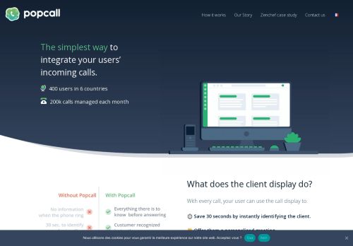 Découvrez Popcall, la solution universelle permettant d'intégrer vos appels reçus sur votre logiciel de gestion, sans aucun changement de téléphonie. S’adapter à tous les systèmes téléphoniques de vos utilisateurs est un vrai cauchemar. Les capteurs électroniques & brevetés Popcall vous permettent d’être compatible avec tous ces systèmes grâce à une intégration simple et rapide. Nous unifions les données d’appels reçus par vos utilisateurs pour vous les livrer de manière standardisée et en temps réel, quelles que soient les technologies utilisées par vos solutions. voir moins